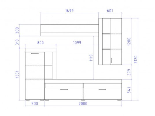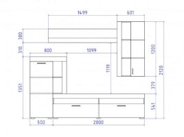 Состав композиции: настенная полка (ВхШхГ): 1499 х 300 х 268 мм; навесной шкаф (ВхШхГ): 1200 х 601 х 440 мм; напольный шкаф (ВхШхГ): 1351 х 800 х 440 мм; ТВ-тумба (ВхШхГ): 514 х 200 х 440 мм. Размер ниши под ТВ (ВхШ): 1099 х 1119.