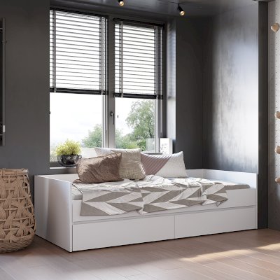 Кровать-трансформер из коллекции "Симпл" - это практичная и комфортная модель для современной спальни. Она удобна в использовании в небольших помещениях - при необходимости ее можно раздвинуть и получить дополнительное спальное место. Кровать оснащена выкатными ящиками, в которых легко размещается постельное белье, текстиль и другие вещи, которым не нашлось места в шкафу. Основание для кровати в комплекте - ламели для раздвижных кроватей. К данной модели кровати можно отдельно приобрести матрас-трансформер.