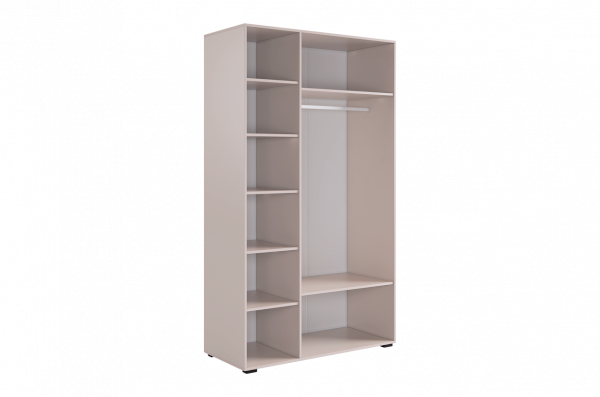 Шкаф имеет удобное наполнение: слева расположены полки для хранения вещей, а справа - штанга для вешалок. Это позволяет рационально использовать пространство и разместить различные типы одежды.