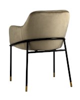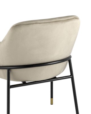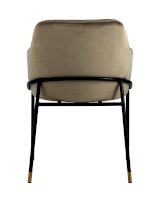 Стул с эргономичной посадкой, мягким сиденьем и широкой удобной спинкой и мягкими подлокотниками. Каркас и ножки черного матового цвета изготовлены из прочного металла с золотым декором, обивка из велюра - износостойкого материала с приятной на ощупь структурой.