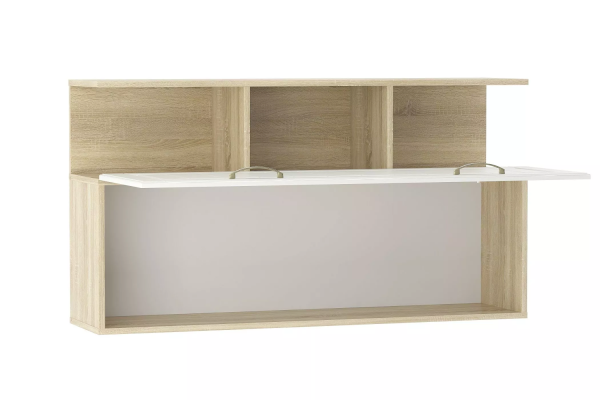 Навесную полку Оливия НМ 040.50 Х можно заполнить большим количеством книг. Нижняя часть модуля оснащена глухим фасадом, который защитит внутреннее содержимое полки от пыли. Для удобства открывания на дверце предусмотрены не одна, а две ручки. Верхние открытые отсеки полки подойдут для демонстрации декоративных элементов.